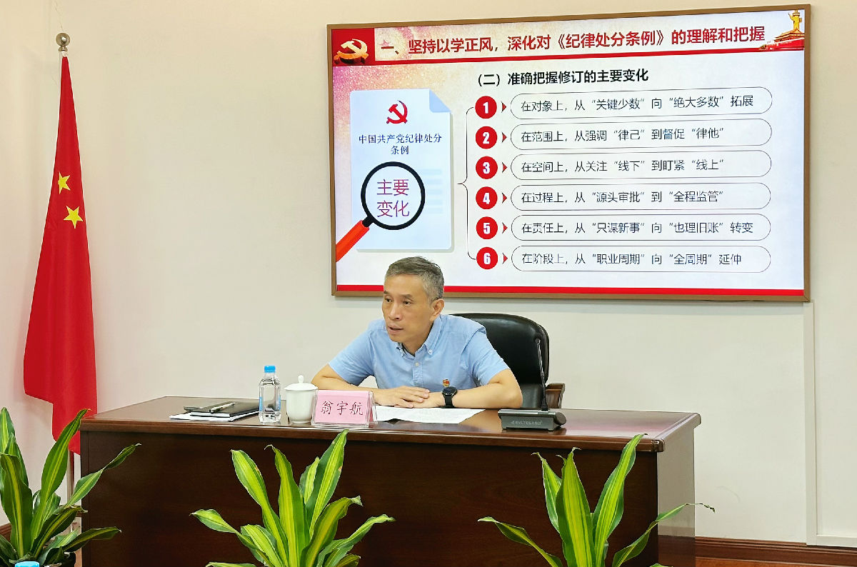 隨后,翁宇航以“堅持學紀知紀明紀守紀 以嚴明紀律推動企業高質量發展”為題講授專題黨課。他強調,閩電投資公司全體黨員干部要堅持以學正風,深化對《紀律處分條例》的理解和把握;要堅持以案為鑒,深刻汲取集團系統違紀違法案件教訓;要堅持以學促干,以嚴明紀律護航企業高質量發展。